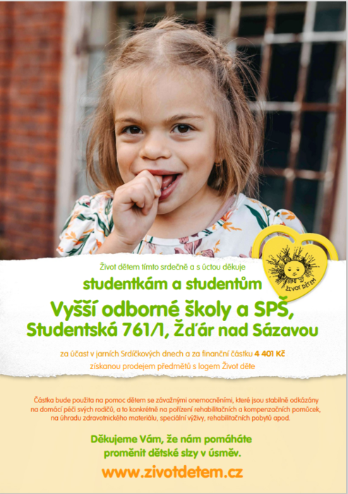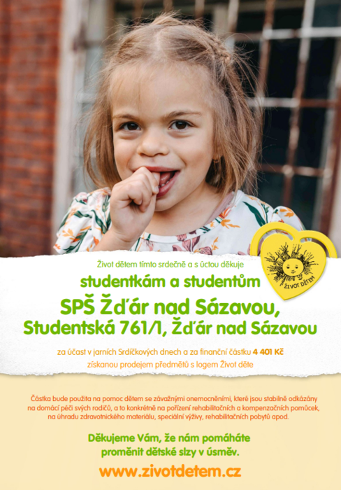 Ve čtvrtek 15. května 2025 se žákyně tříd 1.B a 2.B (Tereza Bořilová, Monika Javůrková, Sabina Javůrková, Lenka Kosová, Monika Mazlová a Aneta Mynářová) zapojily do sbírky Život dětem, která pomáhá vážně nemocným dětem v České republice získat finanční prostředky na úhradu jejich léčby, rehabilitačních a kompenzačních pomůcek, přístrojů a dalšího potřebného k jejich uzdravení a také ke zlepšení kvality jejich života. Žákyním se i přes nepřízeň počasí podařilo získat prodejem předmětů s logem sbírky velmi pěknou částku 4 401 Kč, za což jim patří velký dík náš i dík organizátorů této charitativní akce.