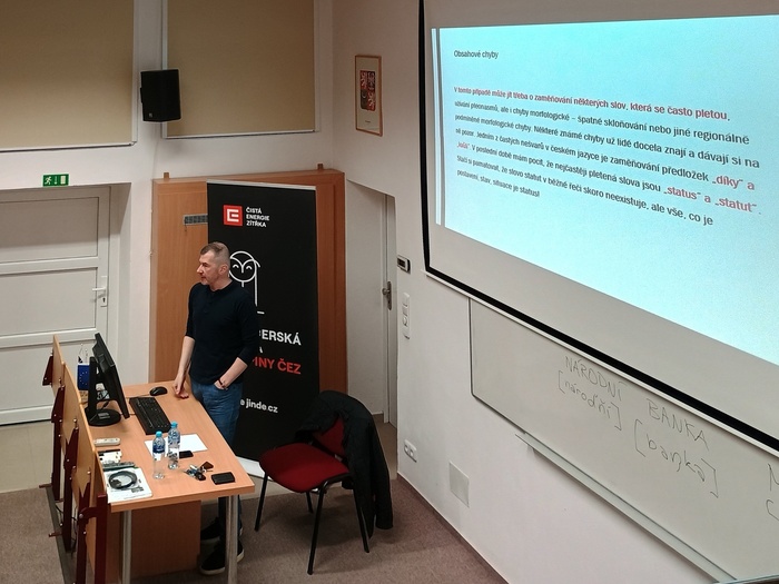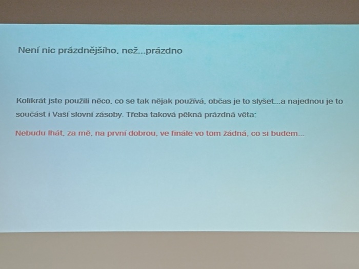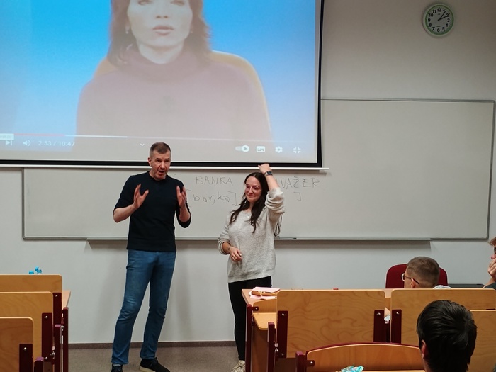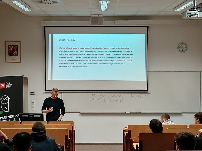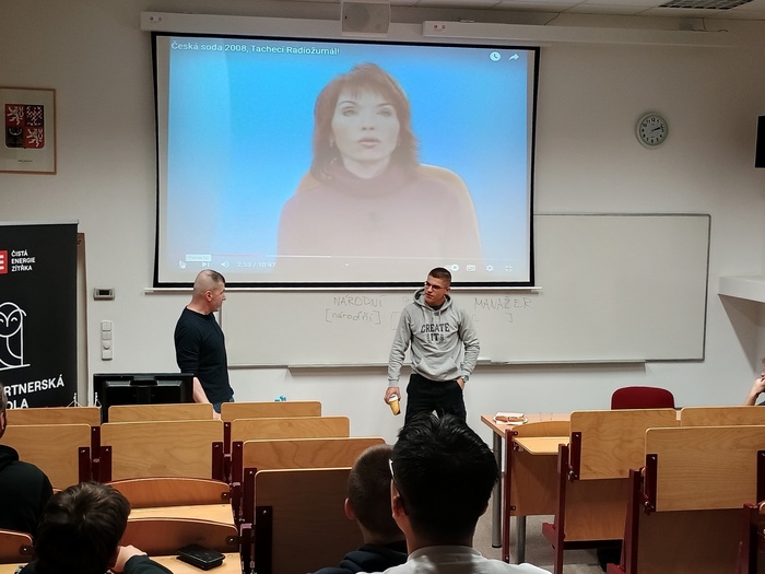 Ve středu 23. 10. a ve čtvrtek 24. 10. se ho zúčastnily všechny maturitní ročníky. Dvouhodinový přednáškový blok, zaměřený na důležité aspekty mluveného jazyka, byl rozdělen na teoretickou a praktickou část. Pan Železný prokládal svůj výklad názornými a srozumitelnými příklady, které často čerpal ze svého profesního i osobního života. Ani žáci nezůstali stranou a aktivně se zapojovali do diskuzí pod dohledem zkušeného moderátora.