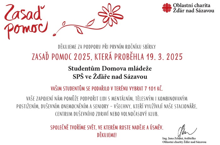 Dne 19. 3. 2025 se čtyři dvojice z ubytovaných děvčat a chlapců na našem domově mládeže zúčastnily charitativní akce "Zasaď pomoc pro lidi v nouzi", kterou organizovala Diecézní charita Brno.
