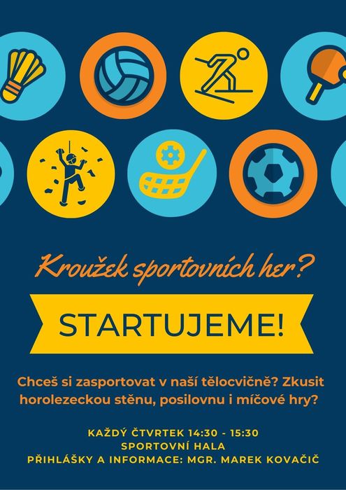 Od 29. 8. 2024 bude ve sportovní hale na prac. Studentská 1 probíhat sportovní kroužek určený žákům školy. Kroužek bude vždy ve čtvrtek od 14:30 do 15:30. Více informací Vám poskytne učitel tělesné výchovy Mgr. Marek Kovačič (kovacic@spszr.cz).