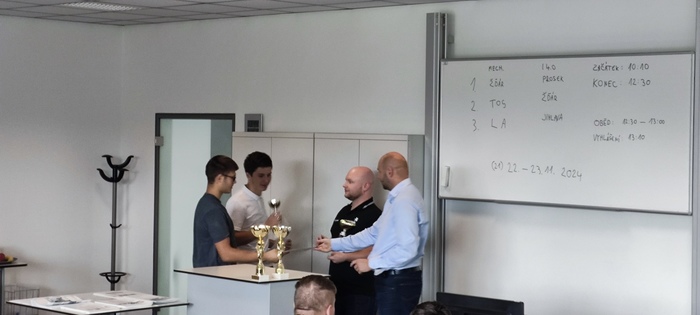 Studenti 4. ročníku oboru Elektrotechnika se dne 1. 10. 2024 zúčastnili soutěže „Automatizace na školách 2024“ pořádanou firmou Festo. Soutěž měla dvě kategorie a to Mechatronika a Průmysl 4.0. V každé kategorii jsme měli jeden tým a to ve složení Tomáš Vejlupek a Ondřej Klimeš v kategorii Mechatronika a Zbyněk Dobiáš a Matyáš Pazour v kategorii Průmysl 4.0. Soutěž se skládala ze dvou kol, kde v prvním korespondenčním kole postoupili v každé kategorii 3 týmy do finále, kde se následně v centrále Festa v Praze utkali o vítězství.