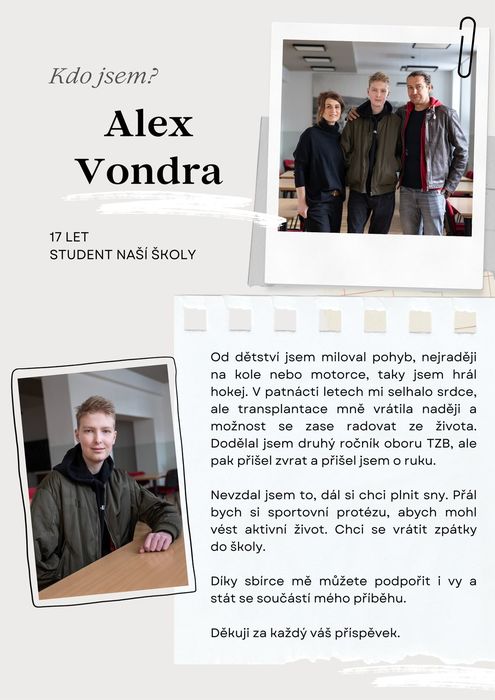 V médiích vyšel článek o příběhu našeho studenta Alexa, kterému se změnil život ze dne na den - v patnácti mu selhalo srdce a podstoupil jeho transplantaci. Pak ale přišel další zvrat a Alex přišel o ruku. Nevzdává se však, bojuje. Chce se vrátit do třeťáku a vést aktivní život. K tomu by mu mohla pomoci sportovní protéza.